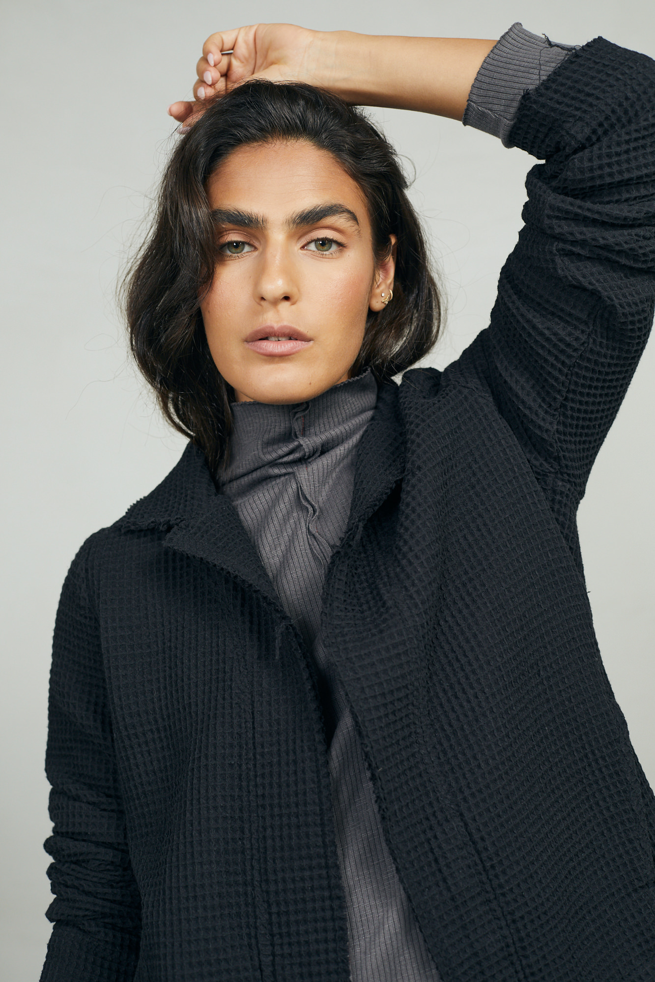 על ג'קט לישקה אפשר להגיד שהוא פשוט מאוד מגניב. עושה חשק ללבוש אותו, כי יש בו כל מה שצריך כדי למקסם הופעה. הוא גם לאלה שאוהבות קצת זרוק, אבל לא מדי. הוא מספיק מרוחק מהגוף כדי להתלבש בשכבות ולהתקלף. עשוי בד פיקה האהוב עלינו במיוחד, ללא כפתורים. אם תגלו טיפה פרימה בקצוות, תדעו שככה התכוונו.