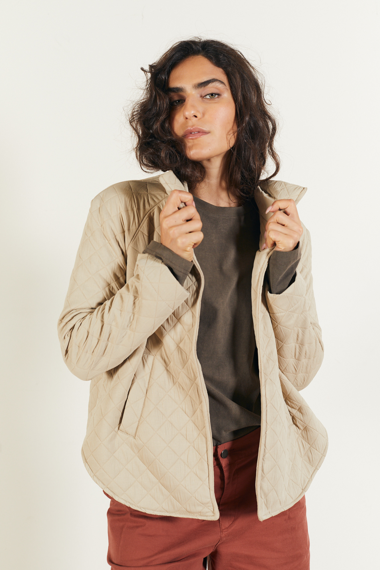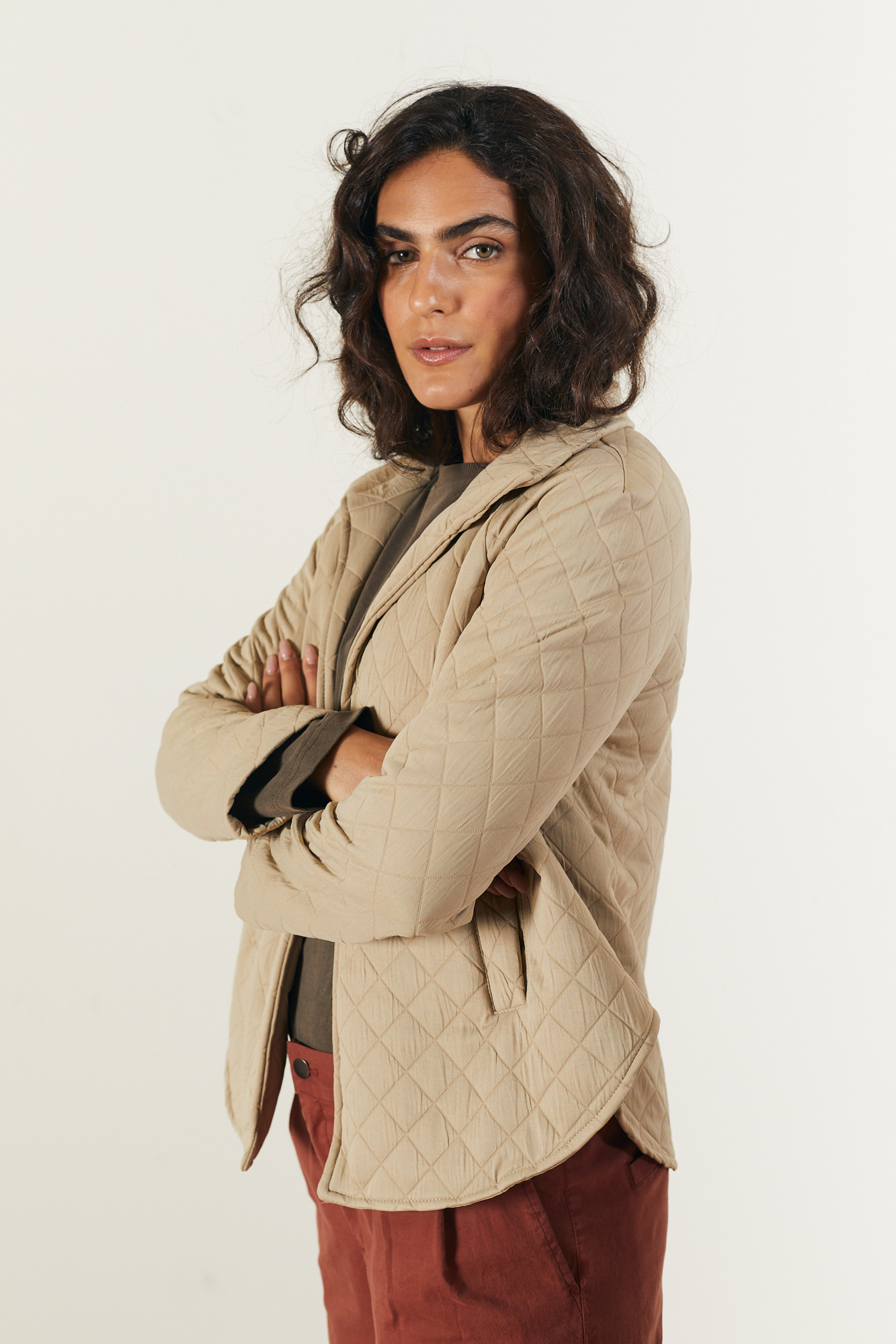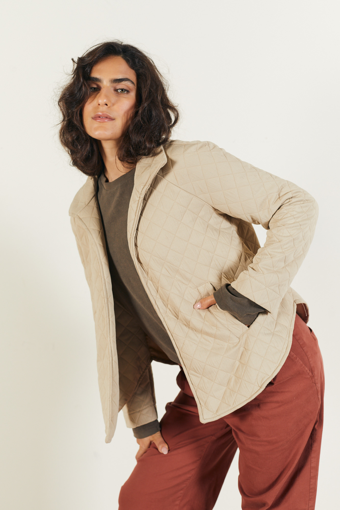ג'קט תמרושקה הוא השילוב האידיאלי בין סטייל לנוחות. שני אלמנטים שאני מקפידה עליהם מאוד. עשויי קווילט לא מאוד עבה, מחמם במידה הנכונה ל"חורף" הישראלי. כיף ללבוש אותו בשכבות, להוסיף צעיף "חיימוש" וליצור לוק הורס . בצילומים, אחינועם לובשת אותו עם מכנסי "אלמונת" צבע בריק, ומתחת, חולצת "שייקה" מקולקציית היוניסקס שלנו. מגיע כמו תמיד במידות נדיבות: