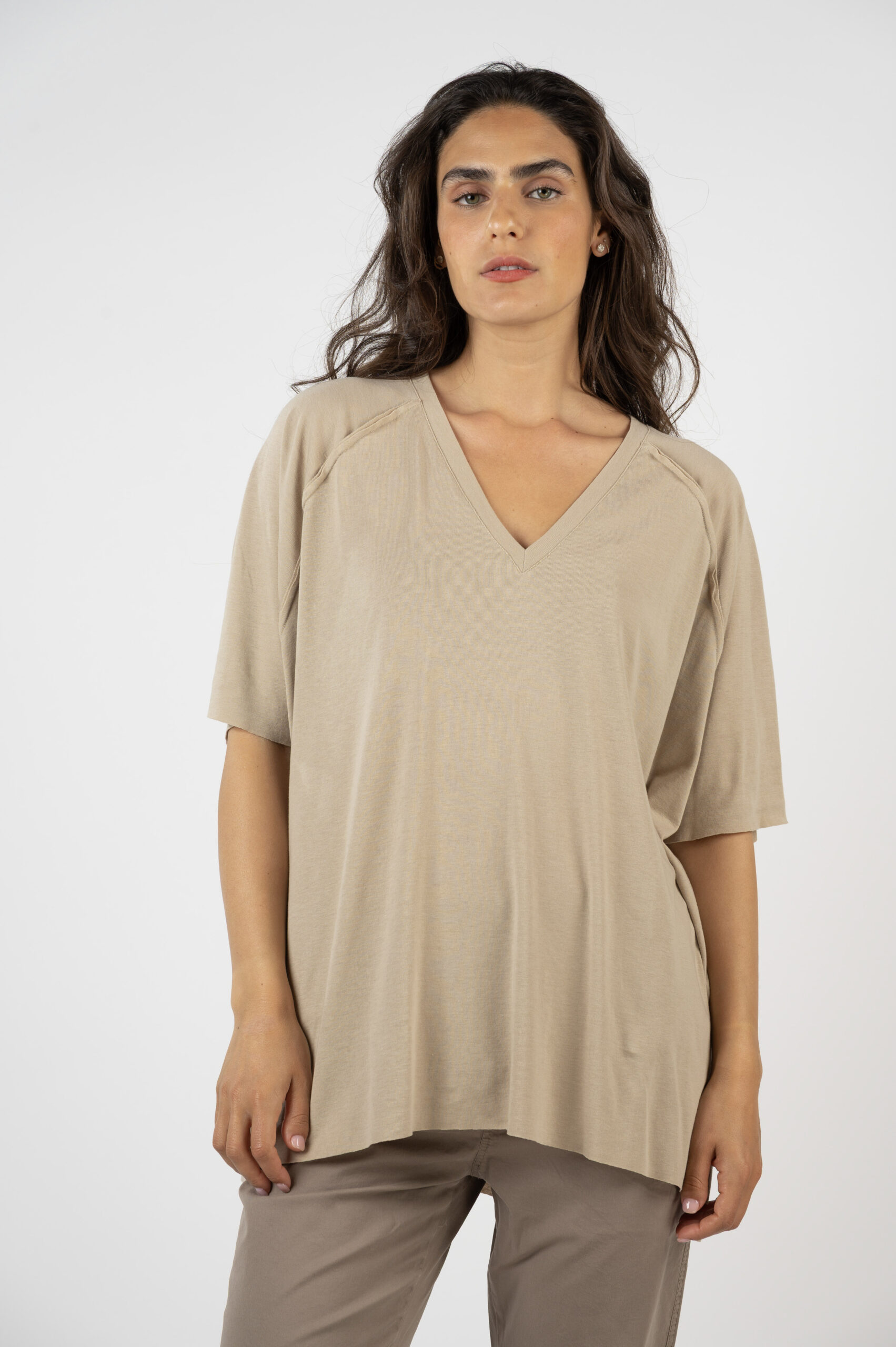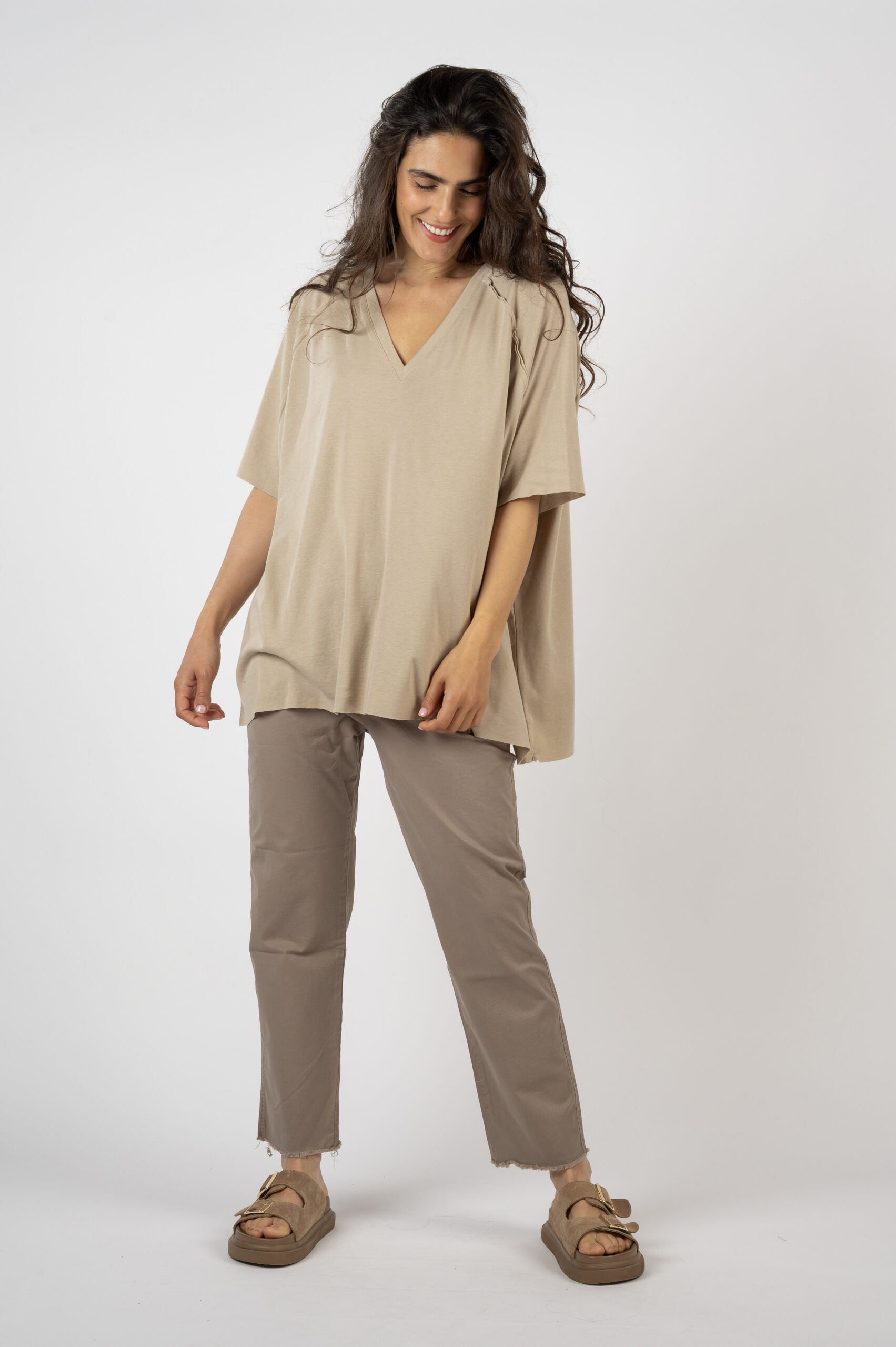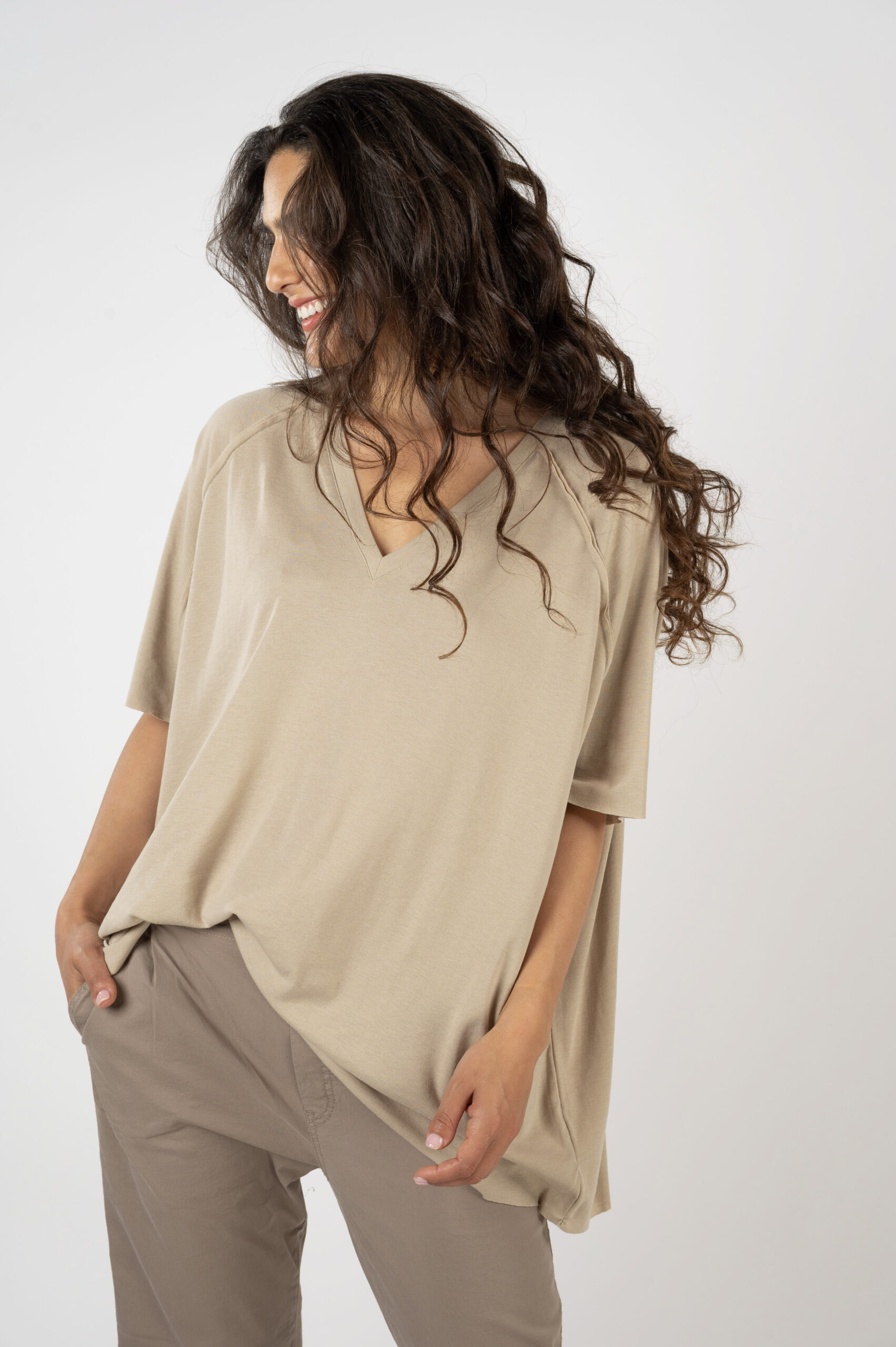 כמה ביקשתן שנעשה חולצות עם פתח V, אז הנה אחת מושלמת. בייסיק OVER SIZE, בגזרת רגלן האהובה, עם נפילה נהדרת. היא גדולה וכיפית, אוורירית ונעימה. כל התפרים שלה חיצוניים למראה קצת יותר מתוחכם. והבד הנעים שיעזור לך לשרוד את הקיץ…