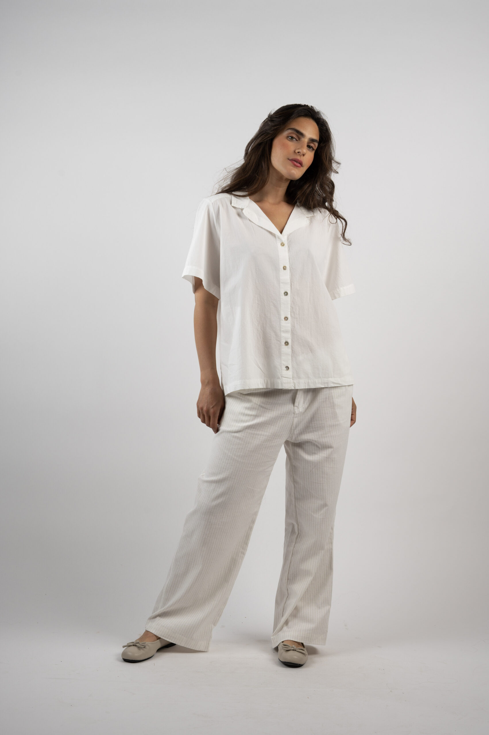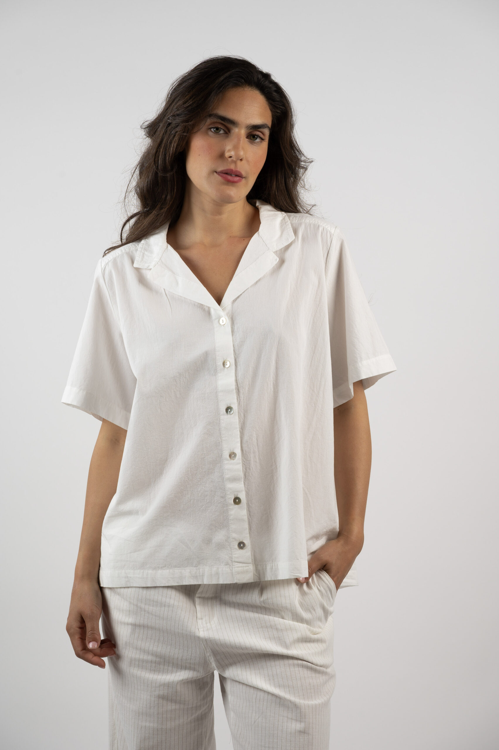 תמיד אהבתי חולצות מכופתרות, כי אפשר ללבוש אותן באופנים שונים. פעם ליום יום ופעם יותר לבוש ומוקפד. פעם מכופתרת , ופעם  פתוחה מעל גופיה. את תבחרי. טופ הוויה היא קלאסית, לא מתאמצת, מחמיאה ומוציאה אותך במיטבך. יש לה צווארון קטן ומפתח מדויק, בגב החולצה יש תיפורים אדומים כך שכל מי שמביט בך מאחור מיד מזהה – את לובשת מדאם בובו. עשויה בד נפלא 100% כותנה.
