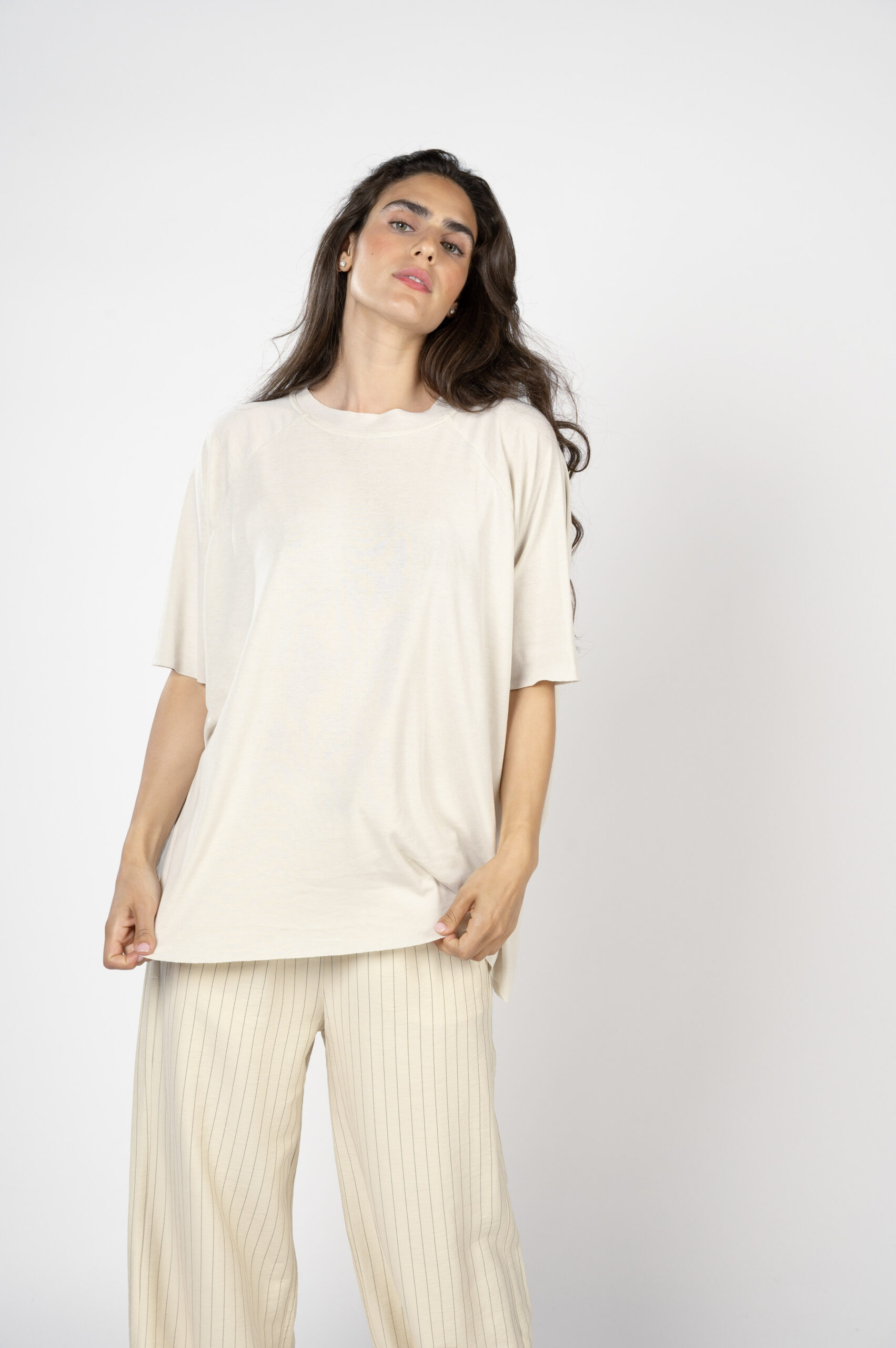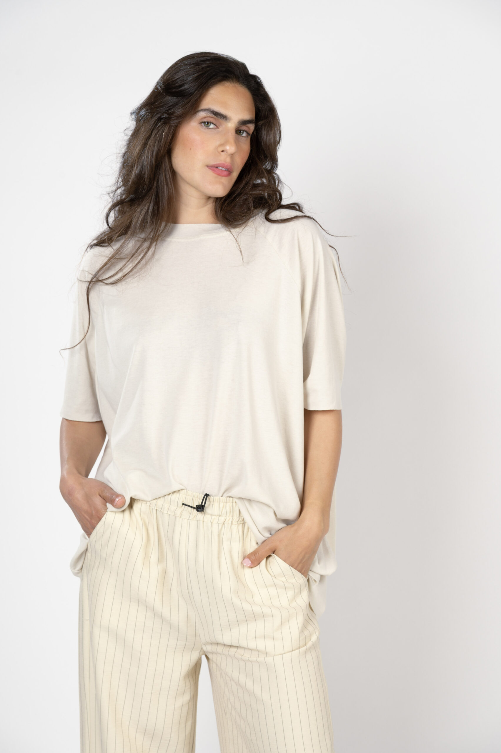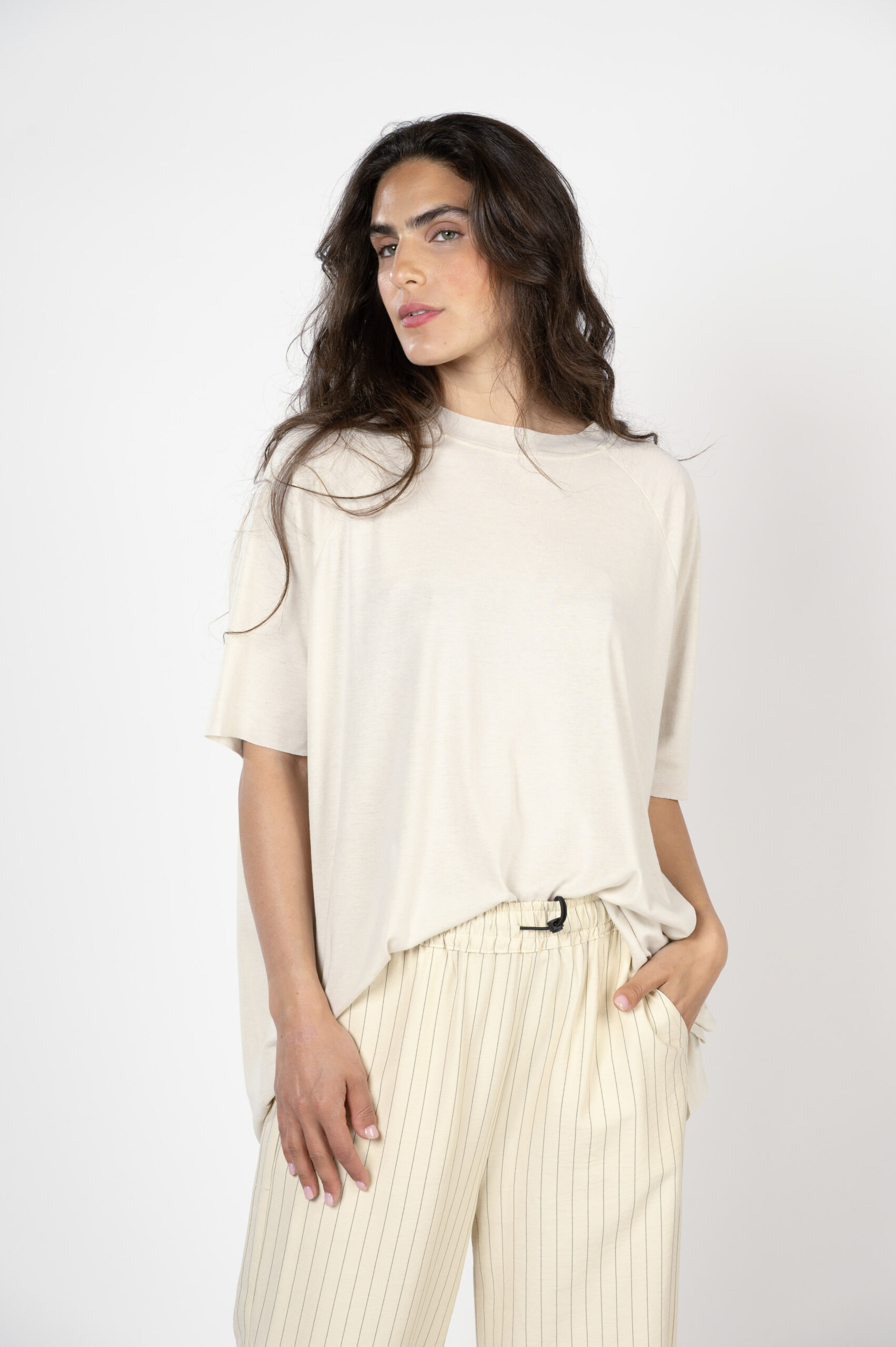 יש גזרות שהן על זמניות. הן תמיד יישלפו ראשונות מהארון. חולצות חרישה קוראים להן… טופ 'התממשות' היא טי שירט OVER SIZE אך בזכות הבד הנפלא, הן נופלות על הגוף ומחמיאות לכל אחת. גזרת ניקי רגלן, עם גימורים לא תפורים, תפר חיצוני בגב ורכות מלטפת שתגרום לקיץ להרגיש אביב…