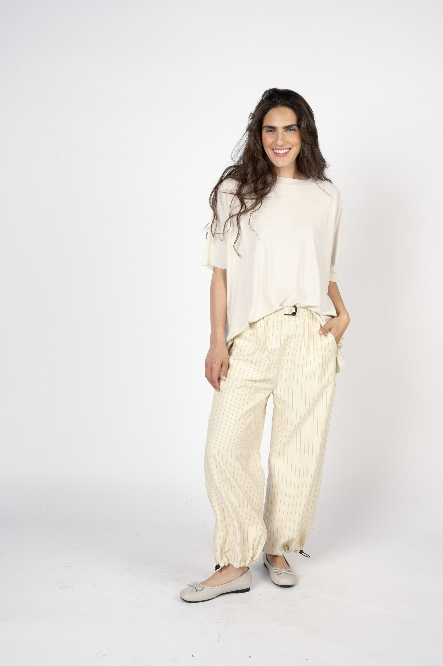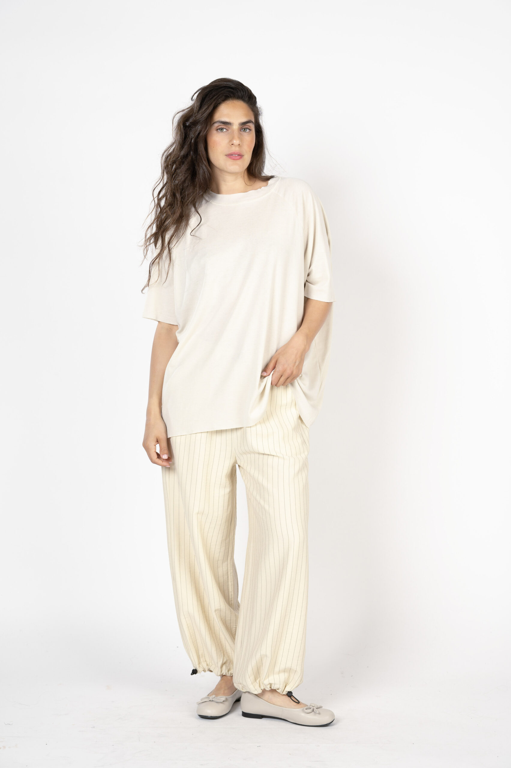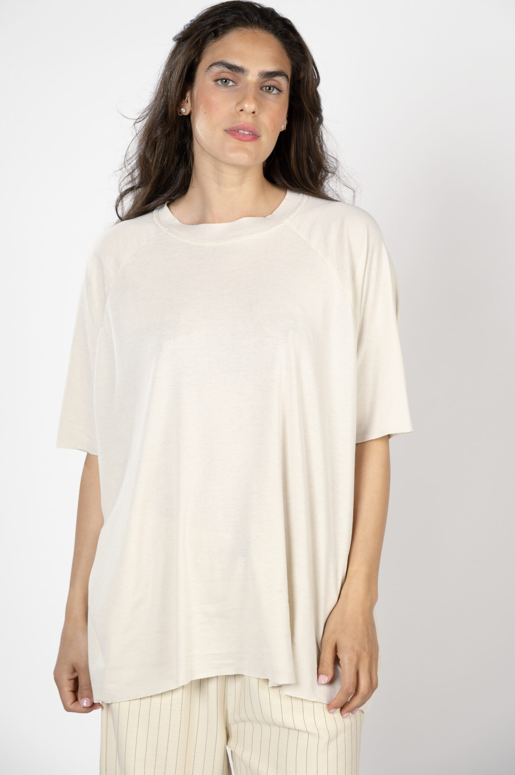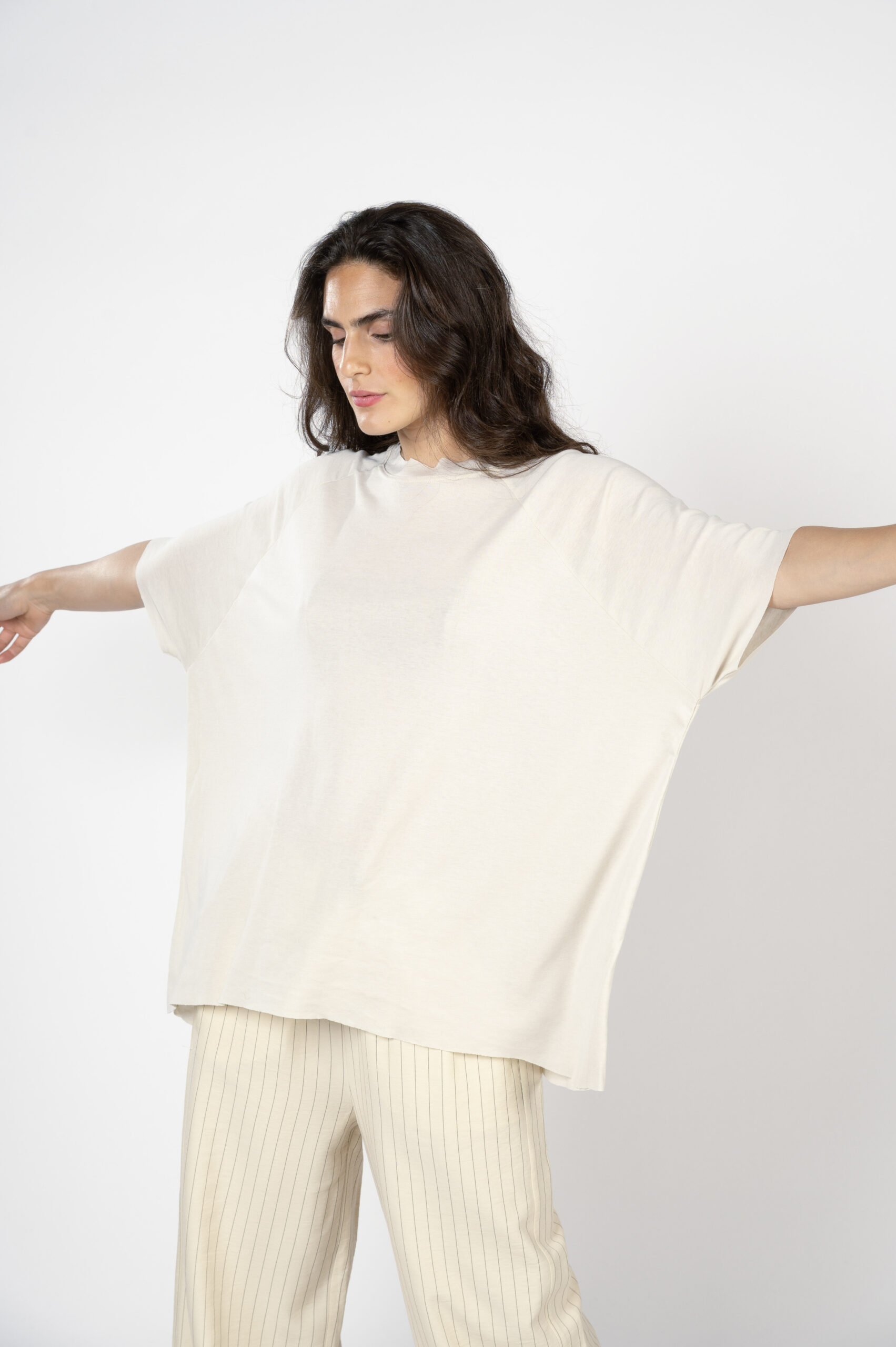 יש גזרות שהן על זמניות. הן תמיד יישלפו ראשונות מהארון. חולצות חרישה קוראים להן… טופ 'התממשות' היא טי שירט OVER SIZE אך בזכות הבד הנפלא, הן נופלות על הגוף ומחמיאות לכל אחת. גזרת ניקי רגלן, עם גימורים לא תפורים, תפר חיצוני בגב ורכות מלטפת שתגרום לקיץ להרגיש אביב…