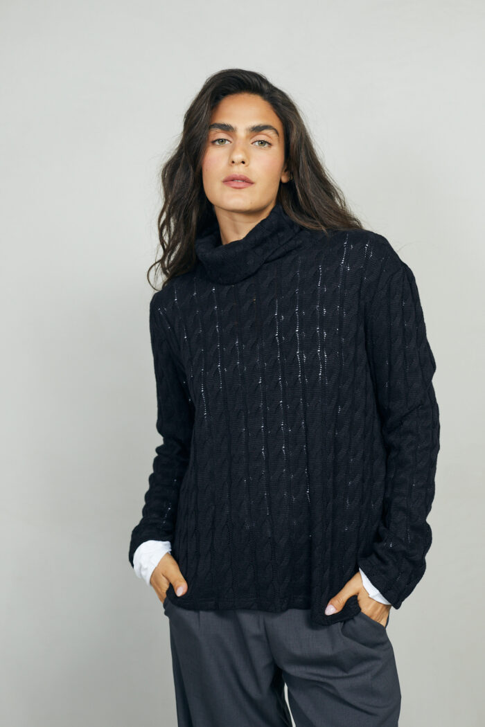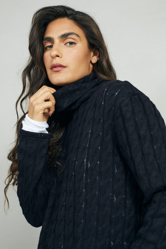 לכל אחת מאיתנו בטוח היתה סבתא שסרגה לה סוודר צמות… זה משהו מפעם, נוסטלגי. אז ניסינו לחזור לזיכרון הזה. אמנם לא בסריגה ידנית, אבל סוודר צמות, מלטף, מחמם ומחבק. גזרת גולף קלאסית שתתאים לכן עם הכל. הבד כל כך נעים שאפשר ללבוש ישירות על הגוף, אבל נסו גם מעל אחת הבייסיקיות שלנו למראה שכבות מהמם. (בתמונות, אתן רואות טופ פיצקי לבנה מבצבצת מבעד לטקסטורת הצמות. הצעה, אם בא לכן…)