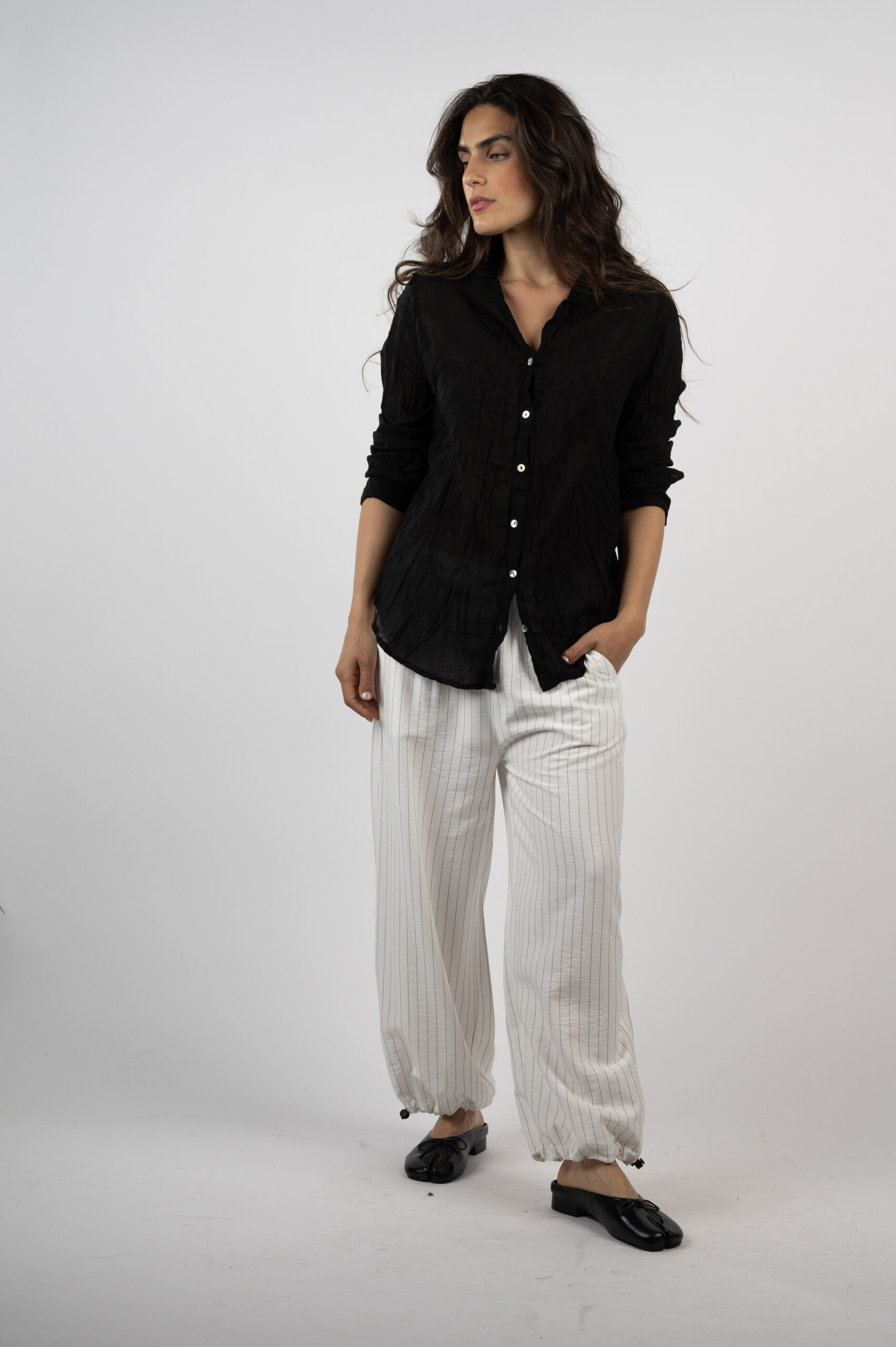 אנחנו משקיעות הרבה מחשבה בייצור דגמים שישרתו אתכן 24/7. מכנסיים מצוינים, שישנו את הלוק שלך בהתאם לנעליים שתנעלי. מכנסי 'התבהרות' הם כאלה. לוק שמשתנה לפי הבחירה שלך. מכנסי התבהרות הם בגזרת בלון. עם בד פסים אקסקלוסיבי, שנופל על הגוף בשלמות. יש לו גומי בקצוות ליצירת מראה בלוני, אבל ניתן גם לשחרר וללכת פתוח. גומי מותן בתוספת קשירת גומי, כיסים עמוקים ונוחים, וכיס גדול עם כפתור מאחור. לערב, לבוקר, לאירוע או סתם שקיעה רומנטית בים…