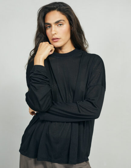 חולצת בייסיק עם מפתח וי יפה ובד נעים. החולצה עברה כביסה ויש סרט עם תכים בגב כמו תכי רקמה בשחור לבן, כי זה תמיד עובד טוב ואנחנו אוהבות.
